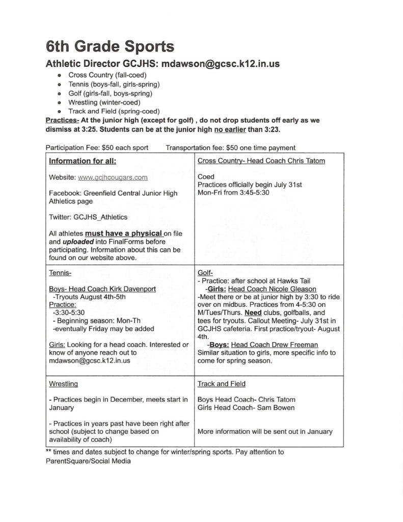 www.gcjhcougars.com Team schedules payment options for athletic teams